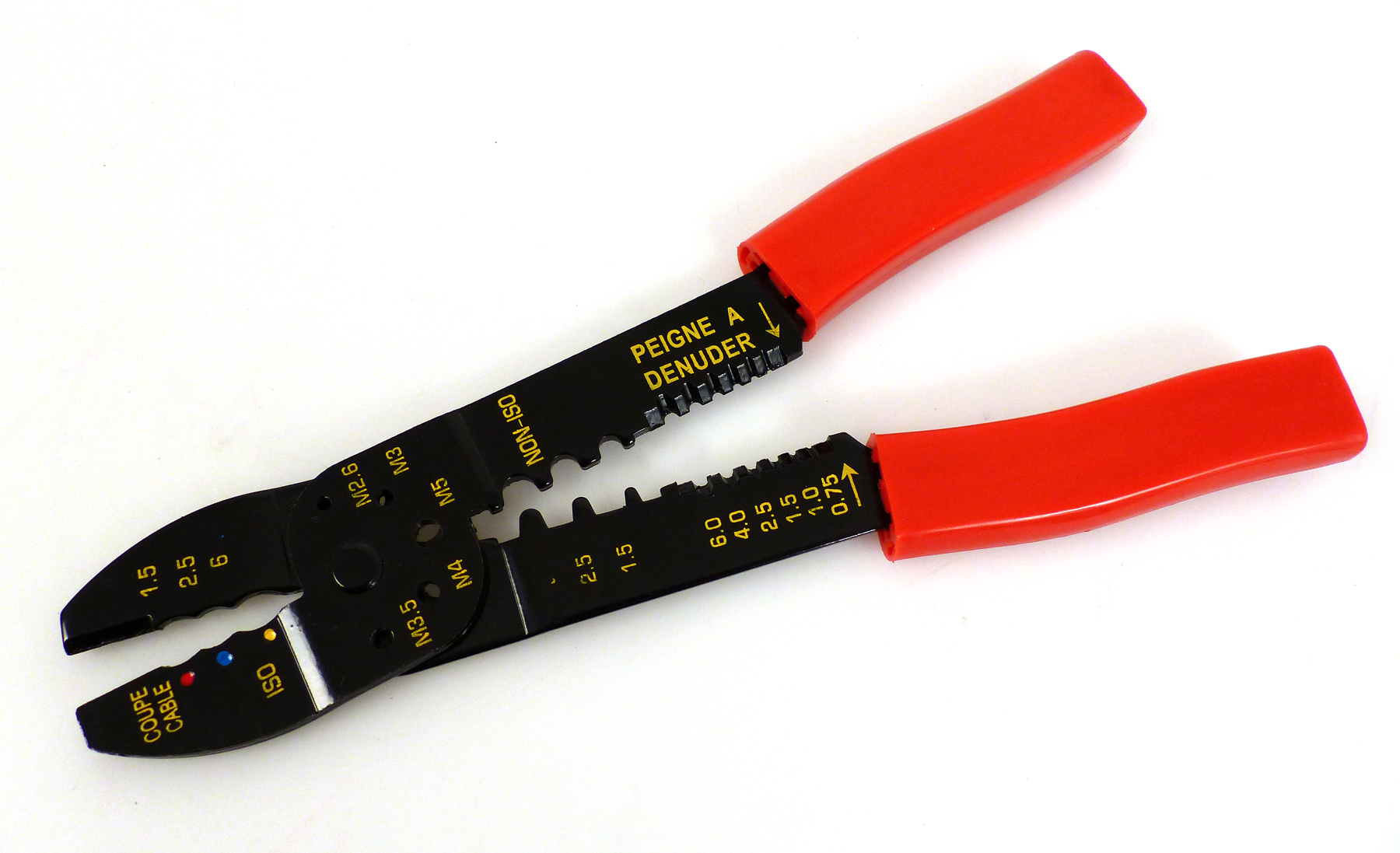 Sertissage pour cosses nues et pré-isolées 1,5 / 2,5 / 6 mm² - Fonction coupe-fil intégré - Dénudage des fils de diamètre de 0,75 à 6 mm² - Coupe vis M2,6 / M3 / M3,5 / M4 / M5.